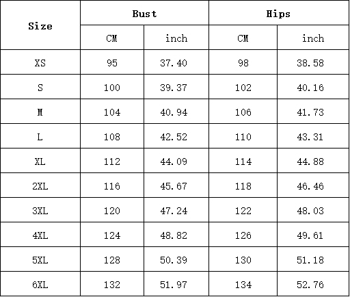 | Bust (inches) | Waist (inches) | Hip (inches) | US Size | UK,AU Size | EU Size | |